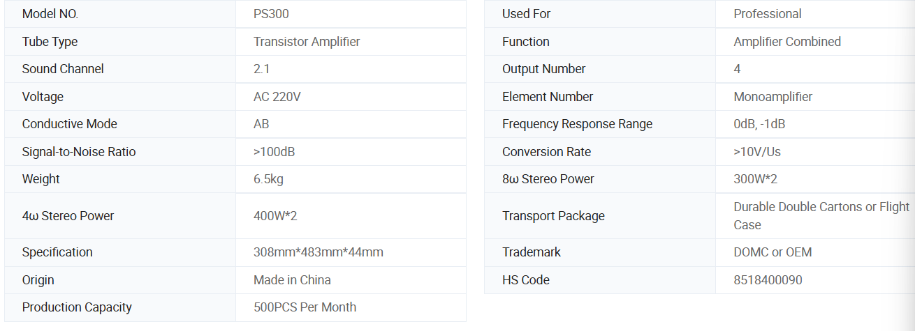 Premium Domc PS300 Two-Channel Audio Amplifier for Audiophiles 8ω Professional Power Amplifier 100dB Snr Low Distortion
